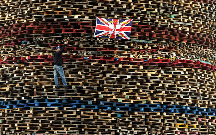 Protestant hardliners have been piling crates to heights of more than 80 feet in Belfast, Northern Ireland, to create massive flammable structures in a centuries-old religious celebration. The structures will be set alight at midnight on Friday.